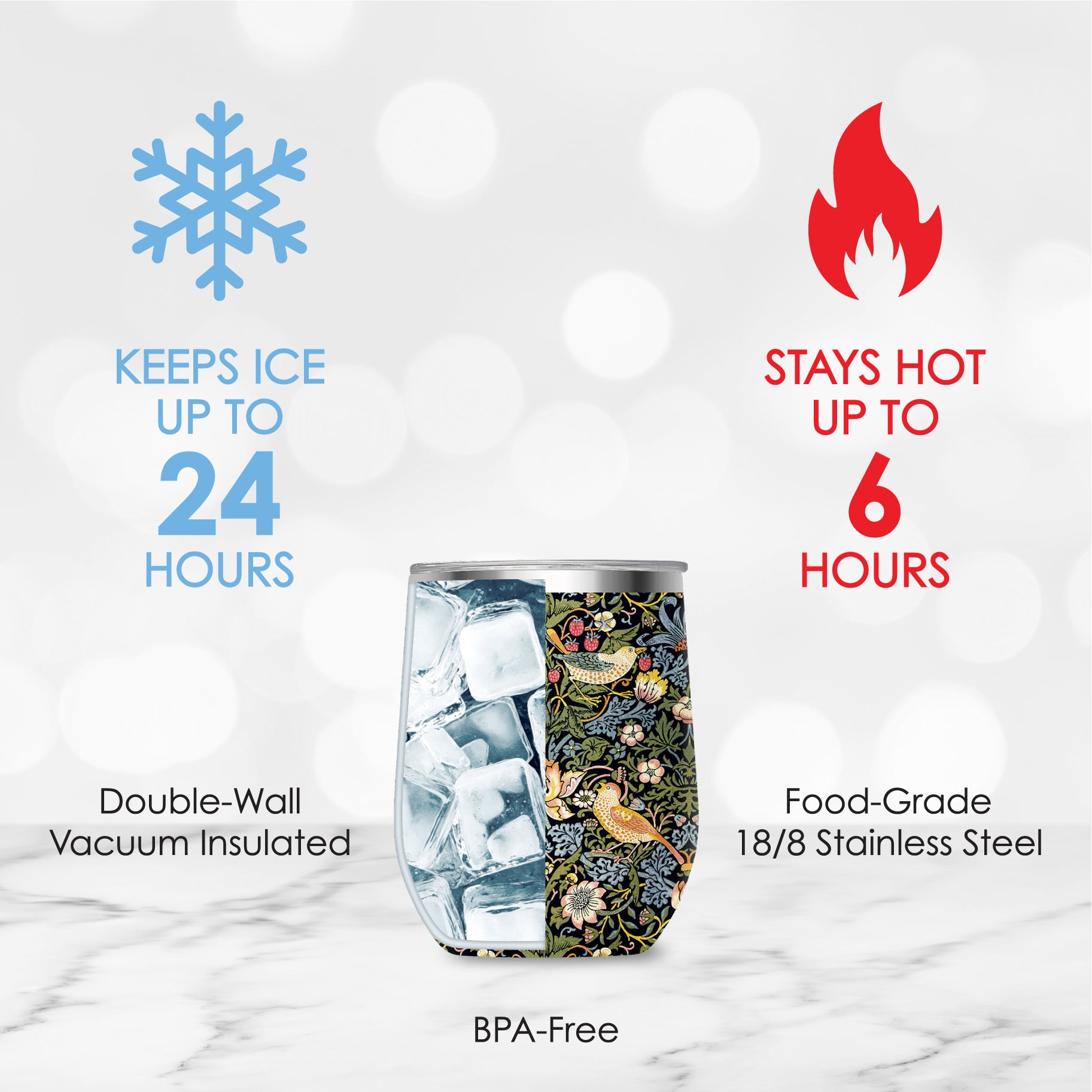 Stay Refreshed On-The-Go with Our 12oz Stainless Wine Tumbler!Discover the perfect blend of style and practicality with our Stainless Steel Wine Tumbler. The sleek, modern design of this Tumbler makes it a fashionable accessory for any occasion. Whether you're hitting the gym, the office, school, or the trails, it's the perfect choice. This double-wall vacuum insulated Tumbler keeps beverages hot for 6 hours and cold for 12, keeps ice frozen for up to 1 day ensuring you're always refreshed. Crafted from durable, BPA-free 18/8 stainless steel, it's a sustainable and eco-friendly choice. The leak-proof design guarantees a mess-free experience, while the wide mouth simplifies cleaning. Elevate your hydration game, reduce waste, and enjoy hassle-free adventures with this travel-friendly companion.Our product features exquisite designs inspired by the timeless artistry of William Morris. Known for his intricate patterns and attention to detail, Morris's work brings a touch of classic elegance and sophistication to our design, making each piece a beautiful blend of art and functionality. Enjoy the rich heritage and artistic flair of William Morris in every aspect of our product.Stunning rendering of William Morris famous art, "Strawberry Thief." The design is captured with an artist's eye for detail, light & color.