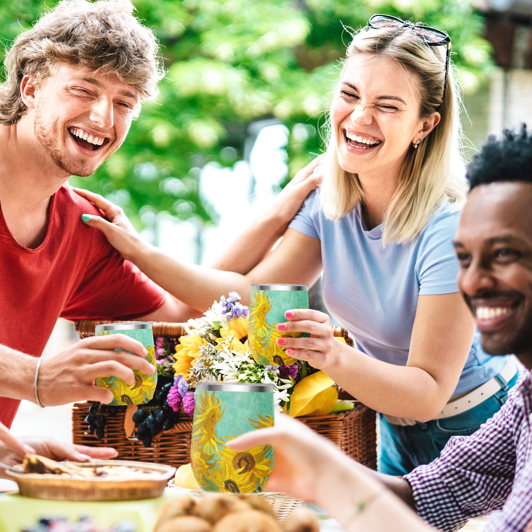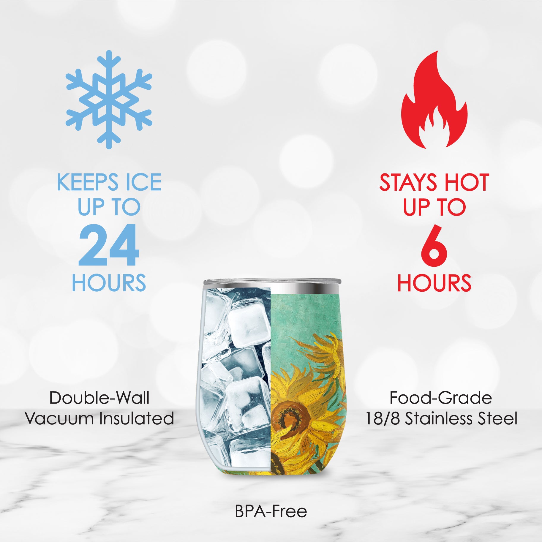 Discover the perfect blend of style and practicality with our Stainless Steel Wine Tumbler. The sleek, modern design of this Tumbler makes it a fashionable accessory for any occasion. Whether you're hitting the gym, the office, school, or the trails, it's the perfect choice. This double-wall vacuum insulated Tumbler keeps beverages hot for 6 hours and cold for 12, keeps ice frozen for up to 1 day ensuring you're always refreshed. Crafted from durable, BPA-free 18/8 stainless steel, it's a sustainable and eco-friendly choice. The leak-proof design guarantees a mess-free experience, while the wide mouth simplifies cleaning. Elevate your hydration game, reduce waste, and enjoy hassle-free adventures with this travel-friendly companion.Our product features exquisite designs inspired by the timeless artistry of Vincent van Gogh. van Gogh's art is celebrated for its bold colors, expressive brushstrokes, and emotional depth. His iconic works, capture the beauty of the world with a unique and vibrant perspective. van Gogh's masterpieces continue to inspire and captivate, making them a timeless addition to any art collection.Stunning rendering of Vincent van Gogh famous art, "Sunflowers." The design is captured with an artist's eye for detail, light & color.